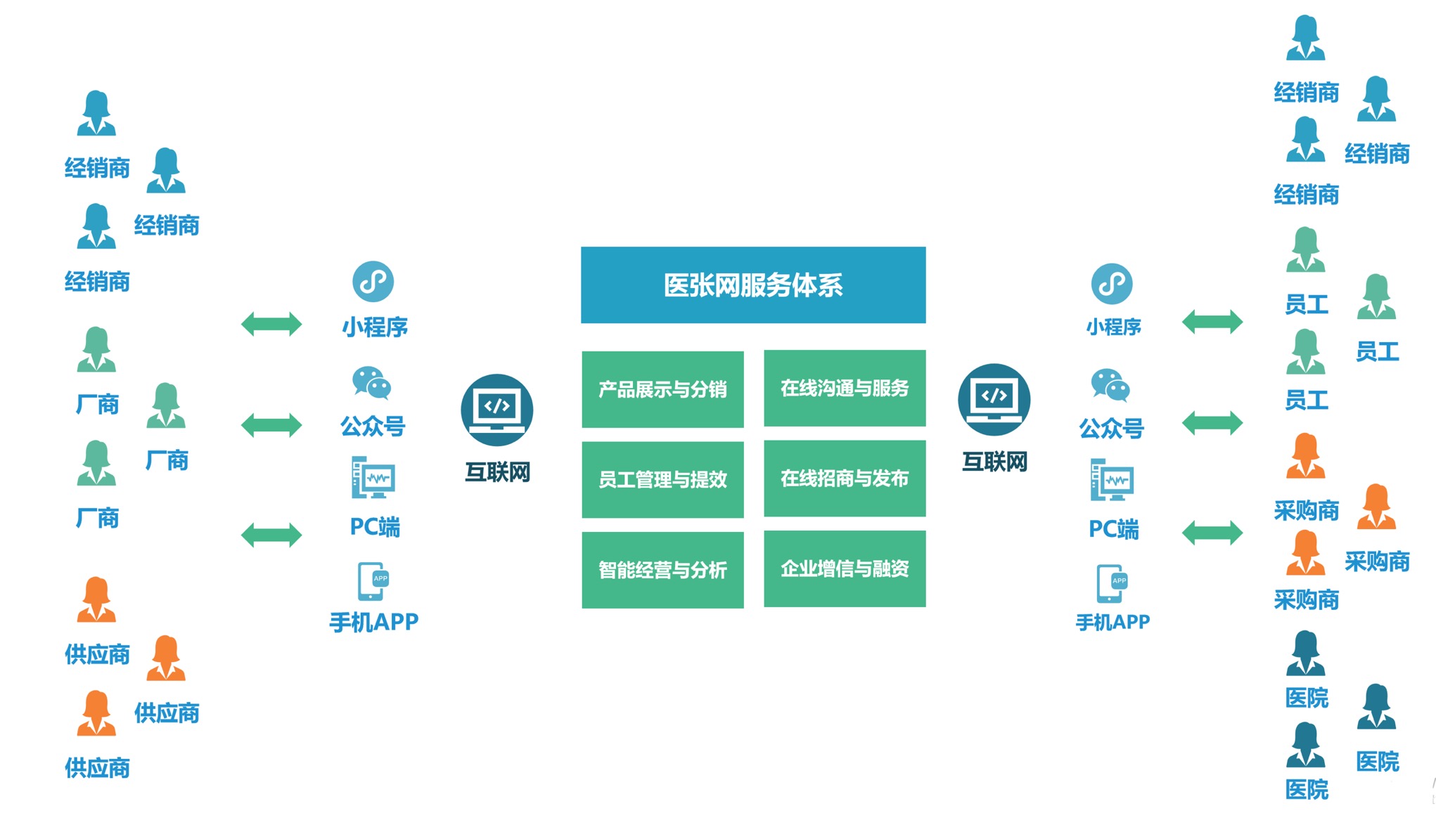 我們認為藥、械是與醫療相關的,服務是與健康相關的,我們通過藥械及服務的供給提升互聯網醫療健康行業的運營能力以及營收能力。